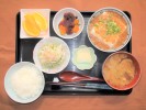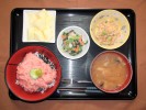 まぐろ丼(キュウリわさび乗せ)、味噌汁(大根、しめじ、あげ)、うの花(あげ、竹輪、人参、さつま揚げ、椎茸、たまご、長ネギ、むき枝豆)、小松菜のごま和え(人参、紅かまぼこ)、フルーツ:リンゴ |