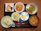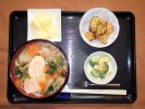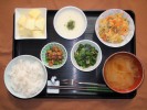 麦ごはん(3割)、味噌汁(ジャガイモ、玉ネギ)、野菜のたまごとじ(キャベツ、人参、椎茸、玉ネギ、たまご)、大和芋すり(青のり)、ほうれん草なめ茸和え、大豆煮(人参、こんぶ、こんやく、グリーンピース)、フルーツ:リンゴ |