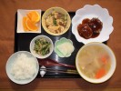 ごはん、味噌汁(白菜、しいたけ、あげ)、麻婆豆腐(豚ひき肉、長ネギ)、ブロッコリーの胡麻ドレ和え、キュウリ中華炒め、煮たまご(黒ごま)、フルーツ:リンゴ |