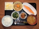 ごはん、味噌汁(白菜、あげ、しめじ)、チリ産の鮭の塩焼き、大根とがんもの含め煮(ハート形人参)、ほうれん草なめ茸和え、大豆五目煮(人参、こんぷ)、フルーツ:リンゴ |