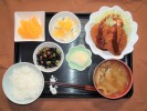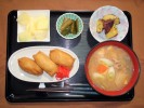 ごはん、味噌汁(白菜、椎茸、あげ)、野菜コロッケ(特製ソース、千切りキャベツ)、マカロニサラダ(人参、キュウリ、ロースハム、ゆでたまご)、ひじきと大豆煮(人参、あげ、むき枝豆)、大根の柚子漬け、フルーツ:伊予柑 |