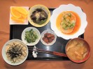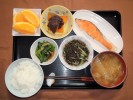 ごはん、味噌汁(白菜、しめじ、あげ)、チリ産の塩鮭焼き、かぼちゃいとこ煮、ほうれん草のなめ茸和え、もずく酢(キュウリ)、フルーツ:バレンシアオレンジ |