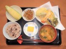お赤飯(ごま塩)、味噌汁(豆腐、なめこ、三つ葉)、天ぷら盛り合わせ(天つゆ、さつま芋、かぼちゃ、ピーマン、パプリカ赤・黄、いんげん、茄子、レンコン、竹輪いそべ)、金平ごぼう(白すり胡麻)、厚焼き玉子、フルーツ:メロン |