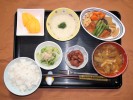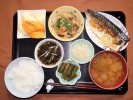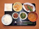 ごはん、味噌汁(白菜、なめこ)、さば塩焼き(かぼす添え)、野菜のたまごとじ(キャベツ、人参、たまねぎ、椎茸、玉子、三つ葉)、もずく「酢(キュウリ)、キュウリ中華炒め、大根おろしと甘酢のしょうが和え、フルーツ:柿、リンゴ |
