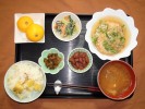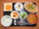 ごはん、味噌汁(白菜、あげ、椎茸)、揚げシューマイの甘酢あんかけ(ピーマン、パプリカ赤・黄)、大根とシーチキンと炒め煮(大根葉)、長芋梅しそ漬け(ゆかり)、うずら豆煮、フルーツ:種なし柿 |