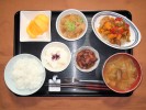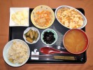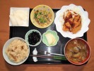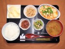 さつま芋ごはん、味噌汁(豆腐、あげ、わかめ、長ネギ)、麻婆茄子(豚のひき肉、万能ネギ)、とりもも肉と大根の治部煮、白菜のおひたし中華和え、ゴーヤ炒め(豚肉、たまご)、フルーツ:リンゴ |