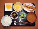 ごはん、味噌汁(茄子、あげ、みょうが)、チリ産の塩鮭焼き、車ふのたまごとじ(三つ葉)、ほうれん草なめ茸和え、うずら豆煮、フルーツ:禅寺丸柿 |
