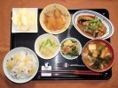 さつま芋ごはん、味噌汁(白菜、椎茸、あげ)、あじフライ(千切りキャベツ、ミニトマト、特製ソース)、うの花(人参、あげ、椎茸、竹輪、さつま揚げ、むき枝豆、長ネギ、たまご)、ほうれん草なめ茸和え、キュウリとみょうがの梅しそ漬け、フルーツ:柿 |
