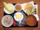 お赤飯(ごま塩)、味噌汁(なめこ、豆腐、三つ葉)、天ぷら盛り合わせ(天つゆ、さつま芋、かぼちゃ、ピーマン、茄子、パプリカ赤、オクラ、いんげん、竹輪いそべ)、金平ごぼう(白すり胡麻)、厚焼きたまご、フルーツ:メロン |