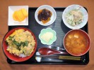 親子丼(とり肉、たまねぎ、なると、たまご、三つ葉)、味噌汁(豆腐、あげ、みょうが)、かぼちゃいとこ煮、酢の物(もやし・キュウリ・竹輪)、大根の柚子漬け、フルーツ:種なし柿 |