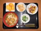 ごはん、味噌汁(とうがん、椎茸、あげ)、ぶりの照り焼き(ジャンボししとう)、がんもの含め煮、ほうれん草なめ茸和え、うずら豆煮、フルーツ:梨 |