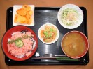 まぐろすき身丼(寿めし、刻み海苔、穂しそ、キュウリわさび乗せ)、切り干し大根煮(人参、あげ、竹輪、さつま揚げ、大根葉)、酢の物(もやし、キュウリ、竹輪、白すり胡麻)、フルーツ:柿 |