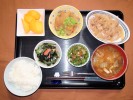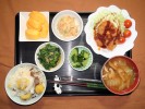 ごはん、味噌汁(白菜、あげ)、豚肉生姜焼き(玉ネギ)、大根とシーチキン煮(大根葉)、キュウリ・ワカメ・カニカマの酢の物、オクラおかか和え、フルーツ:新潟県おけさ柿 |