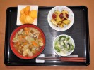 すいとん(豚肉、白菜、人参、椎茸、あげ、長ネギ)、がんも含め煮、大学芋(黒ごま)、ほうれん草しらす和え、フルーツ:次郎柿 |