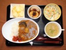 茄子ポークカレー(豚肉、ジャガイモ、人参、たまねぎ、揚げ茄子)、オニオンコンソメスープ(パセコン)、コールスローサラダ(キャベツ、人参、キュウリ)、煮たまご(黒ごま)、フルーツ:リンゴ |