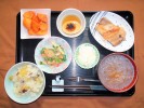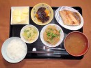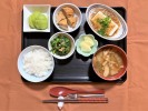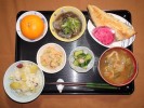 ごはん、味噌汁(大根、なめこ)、ほっけ塩焼き、大根シーチキン煮(大根葉)、かぼちゃいと子煮、白菜のおひたし中華風、フルーツ:リンゴ |
