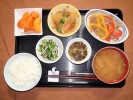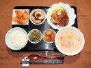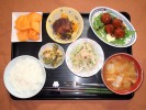 ごはん、味噌汁(白菜、椎茸、あげ)、ミートボール中華甘酢あんかけ(水菜、マヨネーズ)、かぼちゃいと子煮、もやし・キュウリ・竹輪の酢の物(白すり胡麻)、ゴーヤ炒め(豚肉、たまご)、フルーツ:柿 |