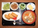 ごはん、ポトフ風スープ(キャベツ、玉ネギ、人参)、アジと白身魚のミックスフライ(千切りキャベツ、特製ソース)、煮たまご(黒ごま)、大根葉のふりかけ(ちりめんじゃこ、おかか)、ソフト揚げの甘煮、フルーツ:柿 |