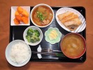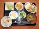 ごはん、味噌汁(玉ネギ、たまご)、一口ヒレかつ(千切りキャベツ、特製ソース)、大根とシーチキン煮、茄子の揚げびたし(万能ネギ)、もずく酢(キュウリ)、フルーツ:リンゴ |
