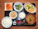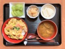 親子丼(とりもも肉、玉ネギ、なると、たまご、三つ葉)、味噌汁(大根、椎茸、あげ)、長芋の梅しそ漬け、白花のいんげん豆煮、フルーツ:キウイフルーツ |
