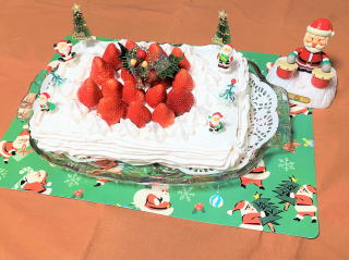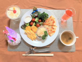 エビピラフ、マルゲリータピザ、フライドポテト、チキンナゲット、フライドチキン、サニーレタス、キュウリ、ミニトマト、ブロッコリー、パセリ、フレンチドレッシング、いろいろきのこのコンソメスープ、フルーツヨーグルト(バナナ、キウイフルーツ、白桃缶、みかん缶、サクランボ)、乾杯:赤シャンパン、おやつ:手作りクリスマスケーキ&珈琲&紅茶 *曜日によって内容が違う時があります。