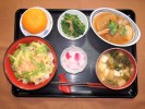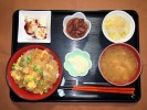 かつ丼(豚ロースかつ、玉ネギ、たまご、グリンピース)、味噌汁(大根、大根葉、あげ)、白菜のおひたし中華風(白すり胡麻)、うずら豆煮、大根の柚子漬け、フルーツ:バナナブルーベリーソースがけ |