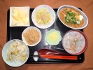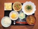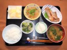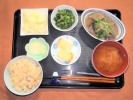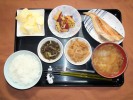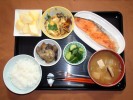 ごはん、味噌汁(白菜、あげ、椎茸)、チリ産の塩鮭焼き、野菜のたまごとじ(キャベツ、人参、玉ネギ、椎茸、三つ葉、たまご)、茄子のポン酢炒め(白すり胡麻)、キュウリ梅しそ漬け、フルーツ;リンゴ |