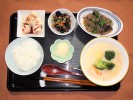 ごはん、味噌汁(白菜、なめこ)、ほっけ塩焼き、レンコン金平、大学芋(黒ごま)、もずく酢(キュウリ)、フルーツ:リンゴ |