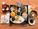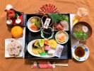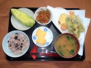 お赤飯(ごま塩)、味噌汁(豆腐、なめこ、三つ葉)、天ぷら盛り合わせ(天つゆ、さつま芋、かぼちゃ、茄子、ピーマン、パプリカ、竹輪いそべ)、金平ごぼう(白すり胡麻)、厚焼きたまご、フルーツ:メロン |