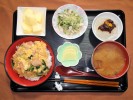 親子丼(とりもも肉、玉ネギ、なると、たまご、三つ葉)、味噌汁(白菜、なめこ)、大根の胡麻味噌田楽(刻み柚子)、もやし・キュウリ・竹輪の酢の物、大根のべったら漬け、フルーツ:リンゴ |