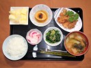ごはん、味噌汁(おふ、ワカメ、長ネギ)、とりもも肉の唐揚げ(パセリ)、ほうれん草のなめ茸和え、煮たまご(黒ごま)、あやめ蕪の酢の物(柚子入り)、フルーツ:リンゴ |