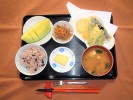 五目炊き込みごはん、味噌汁(大根、なめこ)、茄子の揚げびたし(三つ葉)、ほうれん草なめ茸和え、厚焼きたまご、大根の柚子漬け、フルーツ:リンゴ |