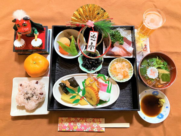 お赤飯(ごま塩)、お雑煮(とり肉、大根、人参、里芋、小松菜、三つ葉、寿なると)、刺身(まぐろ、鯛、大根つま、大葉、パセリ、わさび)、紅白なます(柚子入り)、黒豆煮、煮物(里芋、ごぼう、こんやく、椎茸、花人参、絹さや、レンコン)、紅白かまぼこ、伊達巻、数の子、にしん昆布巻き、フルーツ:みかん、お年玉チョコ、乾杯:ノンアルコールビール |