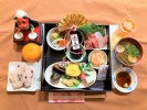 お赤飯(ごま塩)、お雑煮(とり肉、大根、人参、里芋、小松菜、三つ葉、寿なると)、刺身(まぐろ、鯛、大根つま、大葉、パセリ、わさび)、紅白なます(柚子入り)、黒豆煮、煮物(里芋、ごぼうの平煮、こんやく、椎茸、花人参、絹さや、酢蓮)、紅白かまぼこ、伊達巻、数の子、にしん昆布巻き、フルーツ:みかん、お年玉チョコ、乾杯:ノンアルコールビール |