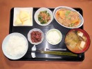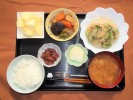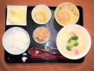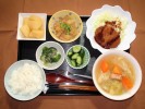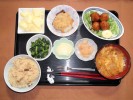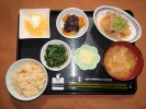 五目炊き込みごはん、味噌汁(玉ネギ、たまご)、ミートボール甘酢あんかけ(水菜、マヨネーズ)、ソフト揚げ(大根おろし、なめ茸)、白花のいんげん豆煮、菜の花の辛子和え、大根の柚子漬け、フルーツ:リンゴ |