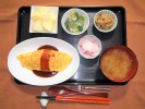 チキンオムライス(特製ソース)、味噌汁(白菜、なめこ)、レンコンの炒め煮、ブロッコリーの胡麻ドレ和え、あやめ蕪の酢の物、フルーツ:リンゴ |