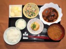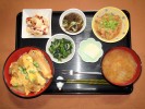 ごはん、味噌汁(大根、なめこ)、煮込みハンバーグ(デミグラスソース)、ほうれん草・しら和え(豆腐、人参、こんにゃく、椎茸)、揚げ出し豆腐(万能ネギ)、長芋の梅しそ漬け、フルーツ:リンゴ |