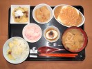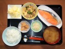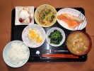 ごはん、味噌汁(白菜、椎茸、あげ)、チリ産の鮭の塩焼き、野菜のたまごとじ(キャベツ、人参、玉ネギ、椎茸、三つ葉、たまご)、マカロニポテトサラダ(人参、キュウリ、ロースハム、ゆでたまご)、ほうれん草なめ茸和え、フルーツ:バナナ(ブルーベリーソースと生クリームがけ) |