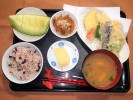 お赤飯(ごま塩)、味噌汁(豆腐、なめこ、三つ葉)、天ぷら盛り合わせ(天つゆ、さつま芋、かぼちゃ、ピーマン、アスパラ、人参、茄子、竹輪いそべ、金平ごぼう(白すり胡麻)、厚焼きたまご、フルーツ:メロン |