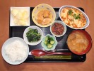 ごはん、味噌汁(白菜、なめこ)、麻婆豆腐(豚挽肉、長ネギ、万能ネギ)、がんもの含め煮、ほうれん草とちりめんじゃこ和え、うずら豆煮、キュウリの梅しそ漬け、フルーツ:リンゴ |
