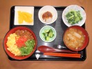 三色丼(とりそぼろ、いり玉子、いんげん、刻み紅しょうが)、味噌汁(白菜、しめじ)、里芋胡麻味噌田楽、レンコンの金平、白菜のおひたし中華風(白すり胡麻)、フルーツ:リンゴ |