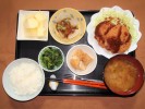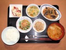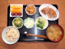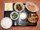 ごはん、味噌汁(豆腐、あげ、ワカメ、長ネギ)、豚肉の生姜焼き(豚ロース、玉ネギ)、ひじき煮(人参、あげ、大豆、むき枝豆)、ほうれん草のなめ茸和え、長芋の梅しそ漬け、フルーツ:リンゴ |