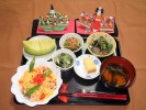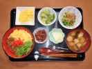 五目ちらし寿司(椎茸、あげ、レンコン、人参、かんぴょう、きんし玉子、とびっこ、でんぶ、絹さや、紅しょうか)、清汁(花ふ、椎茸、三つ葉)、茄子の揚げびたし(三つ葉)、水菜のおひたし(おかか)、酢の物(キュウリ・ワカメ・カニカマ)、厚焼きたまご、フルーツ:メロン |