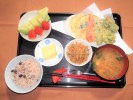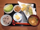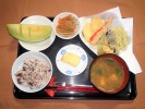 お赤飯(ごま塩)、味噌汁(豆腐、なめこ、見三つ葉)、天ぷら盛り合わせ(天つゆ、さつま芋、かぼちゃ、茄子、ピーマン、パプリカ赤、レンコン、ふきのとう、竹輪いそべ)、金平ごぼう(白のすり胡麻)、厚焼きたまご、フルーツ:メロン |