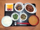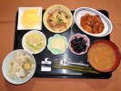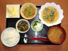 ごはん、味噌汁(白菜、じめじ)、麻婆茄子(豚挽肉)、水菜のおひたし(おかか)、金平レンコン、ふきのとうの天ぷらあんかけ、フルーツ:バナナ(ブルーベリーソースがけ) |