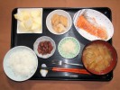 ごはん、味噌汁(白菜、椎茸)、チリ産の鮭の塩焼き、がんもの含め煮、大根おろし甘酢しょうが、うずら豆煮、フルーツ:リンゴ |