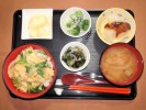 親子丼(とり肉、玉ネギ、なると、たまご、三つ葉)、味噌汁(白菜、椎茸)、大根の胡麻味噌田楽、キュウリ・ワカメ・カニカマの酢の物、ブロッコリーの胡麻ドレがけ、フルーツ:リンゴ |