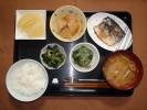 ごはん、味噌汁(白菜、あげ)、鯖の塩焼き、ほうれん草のなめ茸和え、ブロッコリーのごまドレ和え、がんも含め煮、フルーツ:メロ―ゴールド |