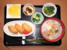 あさりごはん、味噌汁(白菜、なめこ)、カツオ立田揚げ、あげと小松菜の炒め、ブロッコリーのごまドレがけ、ソフト揚げ甘煮、大根の柚子漬け、フルーツ:カシュ―オレンジ、ぶどう(レッドグローブ) |