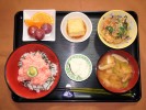 まぐろ丼(刻み海苔、キュウリわさび乗せ)、味噌汁(豆腐、あげ、椎茸)、野菜のたまごとじ(キャベツ、人参、たまねぎ、椎茸、三つ葉、たまご)、揚げ出し豆腐、長芋の梅しそ漬け、フルーツ:カシュ―オレンジ、ぶどう(レッドグルーブ) |